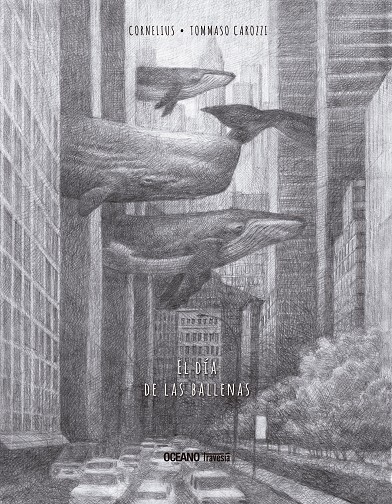 Es una ciudad grande como cualquiera, llena de edificios y automóviles. De pronto, enormes sombras comienzan a cruzar el cielo: ¡son gigantescas ballenas, de todas clases, que cruzan volando como si nadaran! La belleza de esta escena es contrastada por la violencia de la respuesta de los hombres de la ciudad, que deciden atacar con todo. Un libro sin palabras y en blanco y negro que sorprende por la precisión de sus imágenes, la belleza casi cinematográfica de sus páginas y un dramatismo contrapunteado con un enorme sentido del humor.
