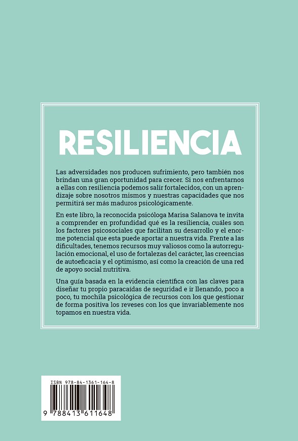 En este libro, la reconocida psicóloga Marisa Salanova te invita a comprender en profundidad qué es la resiliencia, cuáles son los factores psicosociales que facilitan su desarrollo y el enorme potencial que esta puede aportar a nuestra vida. Recursos muy valiosos como la autorregulación emocional, el uso de fortalezas del carácter, las creencias de autoeficacia y optimismo, así como la creación de una red de apoyo social nutritiva. Una guía basada en la evidencia científica con las claves para diseñar tu propio paracaídas de seguridad e ir llenando, poco a poco, tu mochila psicológica de recursos con los que gestionar de forma positiva los reveses con los que invariablemente nos topamos en nuestra vida.