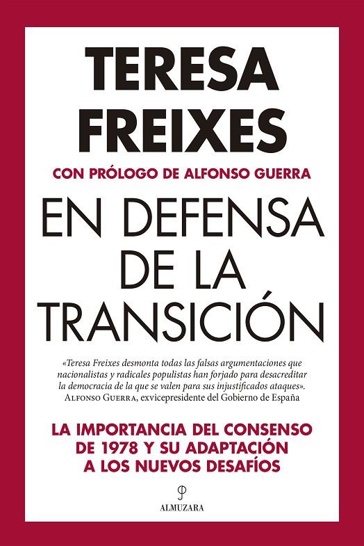 En un momento crucial de la historia de España, Teresa Freixes nos ofrece una perspectiva esclarecedora sobre el proceso que llevó a la consolidación de la democracia en España, al tiempo que nos hace reflexionar sobre la vigencia del «consenso del 78». Desde los desafíos enfrentados durante la Transición hasta las amenazas actuales contra el Estado de derecho, la catedrática en Derecho Constitucional y jurado de los Premios Princesa de Asturias nos invita a reflexionar sobre los principios democráticos y el imperativo de defenderlos frente a las adversidades. Con una mirada crítica pero esperanzadora, desmonta los mitos y falsas narrativas que buscan socavar la legitimidad de la democracia española. Su compromiso con la verdad y la justicia resuena a lo largo de estas páginas, recordándonos la importancia de mantenernos vigilantes ante cualquier amenaza contra nuestras libertades y derechos. Estas páginas no solo son un testimonio histórico imprescindible, sino también un llamado a la acción para preservar y fortalecer los cimientos de nuestra democracia, que nos instan a asumir la responsabilidad de proteger el legado de la Transición y defender los principios democráticos que tanto costó alcanzar. Una obra indispensable para comprender nuestro pasado, reflexionar sobre nuestro presente y forjar un futuro más justo y democrático para todos. «No se puede elegir el tiempo en que vivimos, pero sí se puede elegir la respuesta que damos a ese tiempo que nos ha tocado vivir. En los años setenta del siglo pasado una generación optó por dar una respuesta inédita en nuestra historia: frente a la confrontación, el pacto. Una generación que se sabía destinada a cerrar un capítulo ominoso de la historia de España y que no pensaba en la revancha, sino en una España cívica, humana. Y si para ello había que empujar hacia la convivencia y la tolerancia, hagámoslo; esa fue la divisa del momento y del lugar». Alfonso Guerra, exvicepresidente de Gobierno de España.